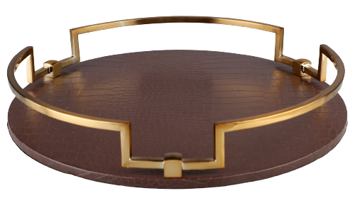 This stylish decorative tray is crafted from gold iron and faux leather trim to blend with any interior design. Perfect as a table top decor, a way to organize desk clutter, or for serving and entertaining guests. Available in 2 colors.